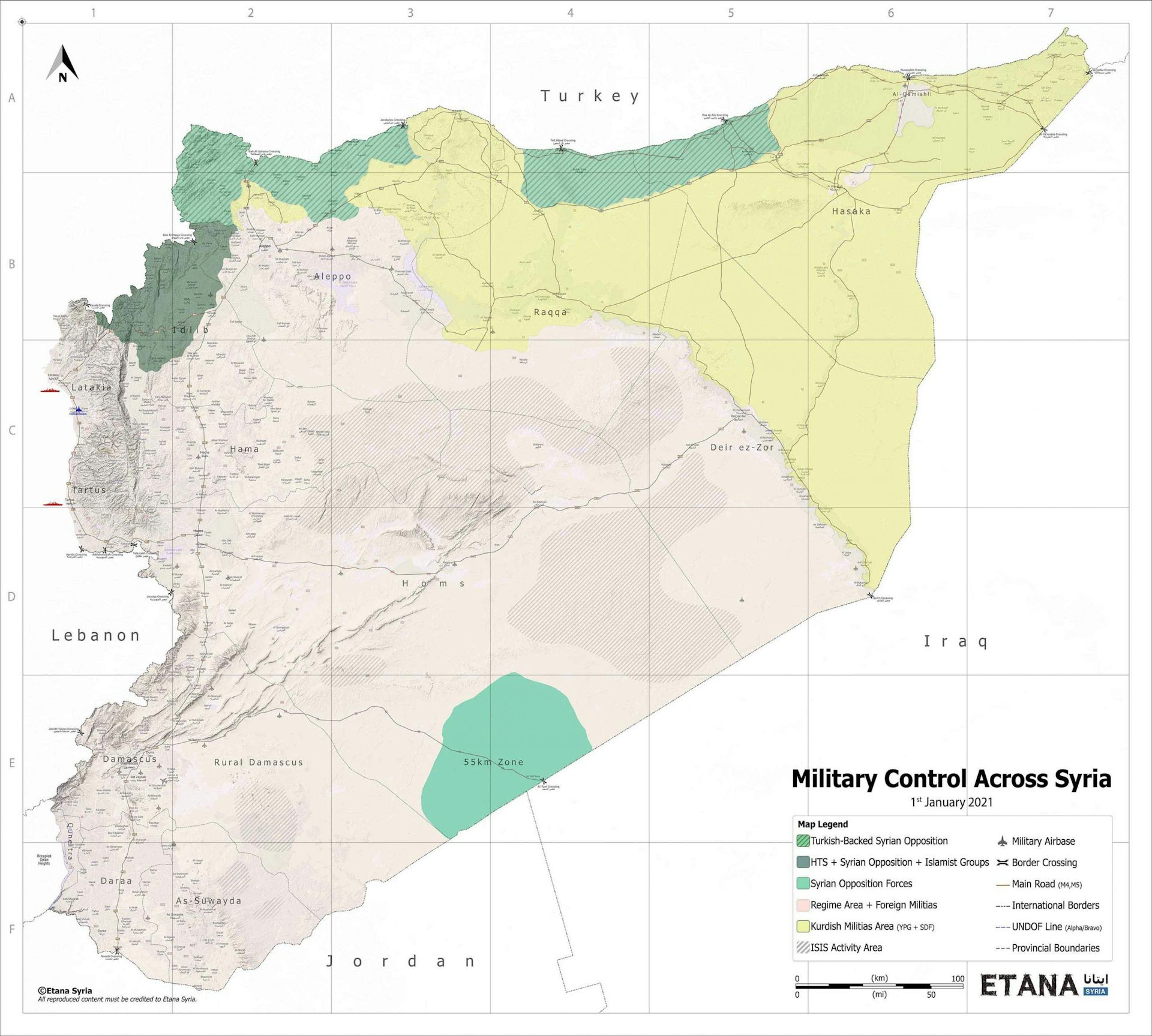 Состояние конфликта . В начале 2022 года специальный посланник Организации Объединенных Наций (ООН) по Сирии Гейр Педерсен охарактеризовал конфликт в Сирии — между сирийским правительством и его партнерами, с одной стороны, и различными оппозиционными и экстремистскими группировками, с другой — как «патовую ситуацию», отметив, что «В военном отношении линии фронта остаются неизменными».