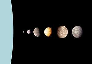 По диаметральному сечению они превышают отметку в 472 км. В мире учёных существует предположение о том, что все крупные луны возникли в рамках особого диска, который присутствовал вокруг планеты долгое время. Атмосферы у них в основном не имеется, а орбитальный путь создаёт колоссальные колебания сезонного характера.
