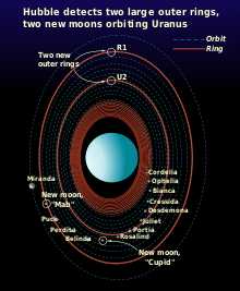 Уран был единственной планетой-гигантом, у которой не было известно нерегулярных спутников, но с 1997 года наземными наблюдениями было обнаружено девять отдалённых нерегулярных спутников. Ещё два маленьких внутренних спутника, Купидон и Маб, были открыты в 2003 году с использованием космического телескопа «Хаббл». Последний из обнаруженных на 2008 год спутников Урана — Маргарита — был открыт в 2003 году[6].
