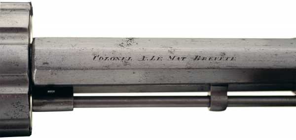 Маркировка на верхней грани ствола представляет собой текст «COLONEL A. LEMAT BREVETE»
