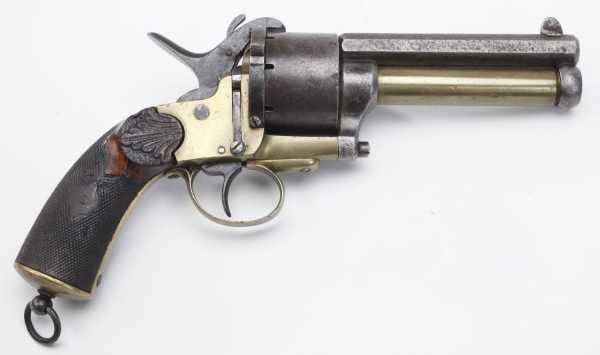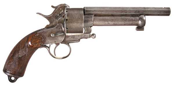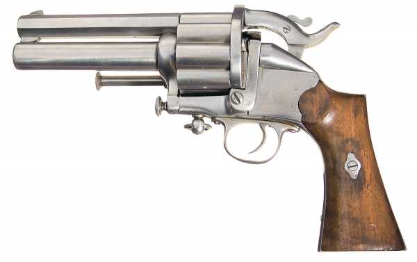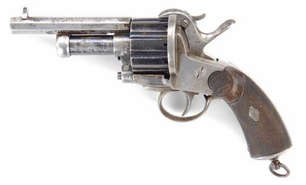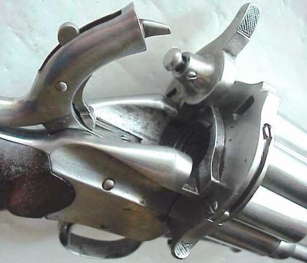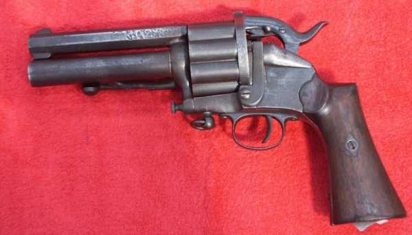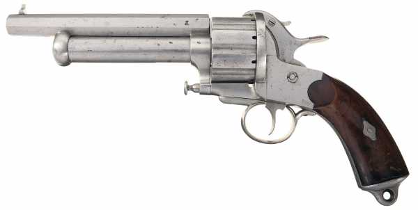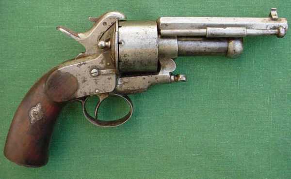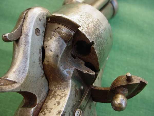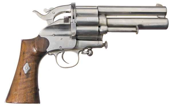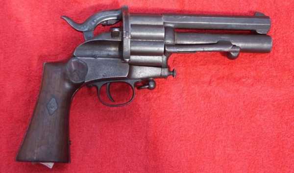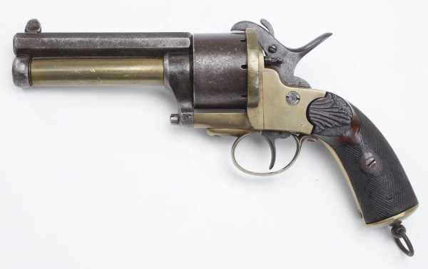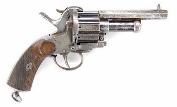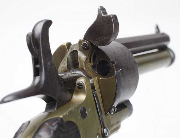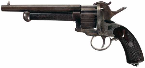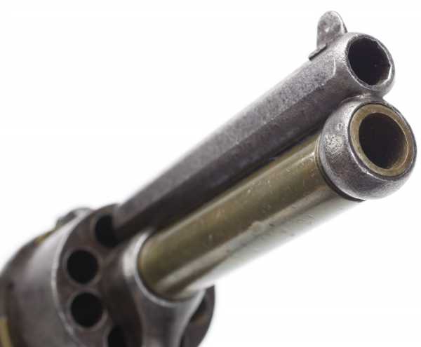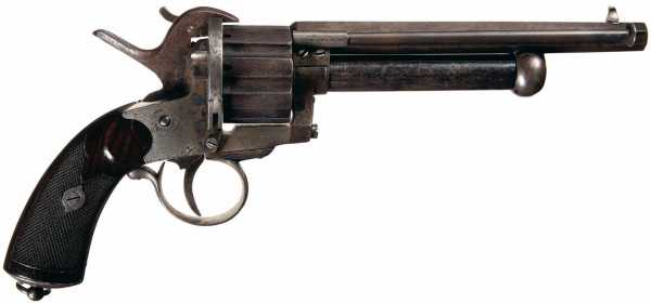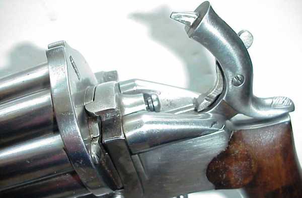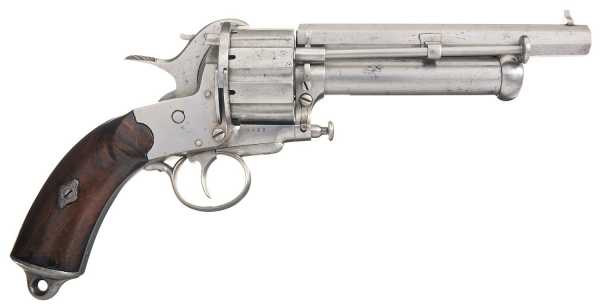 Вначале появились револьверы, барабаны которых снаряжались шпилечными патронами, а центральные стволы по прежнему были капсюльного воспламенения.