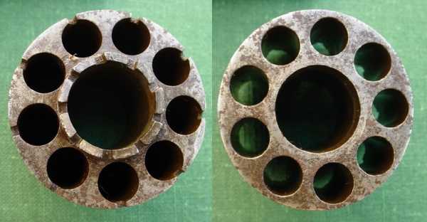 На заднем срезе барабана выполнен храповик для механизма вращения и выточки в верхних частях камор для размещения шпилек патронов. Передняя часть барабана не имеет отверстий для механизма фиксации. Барабан предназначен для размещения шпилечных патронов калибра 8 мм.