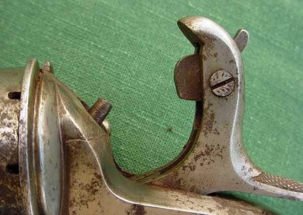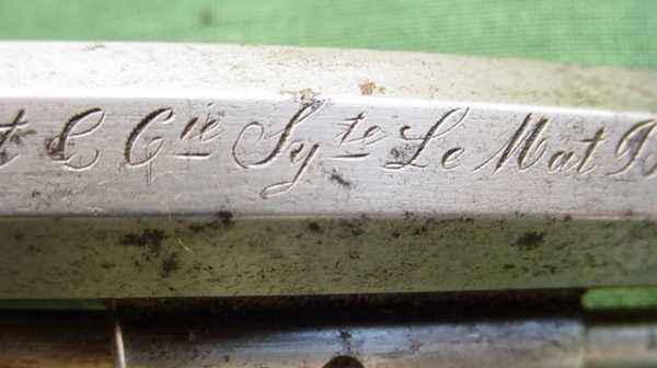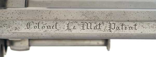 Маркировка «Colonel Le Mat Patent» на верхней грани ствола выполнена заглавными и прописными буквами красивым готическим шрифтом.