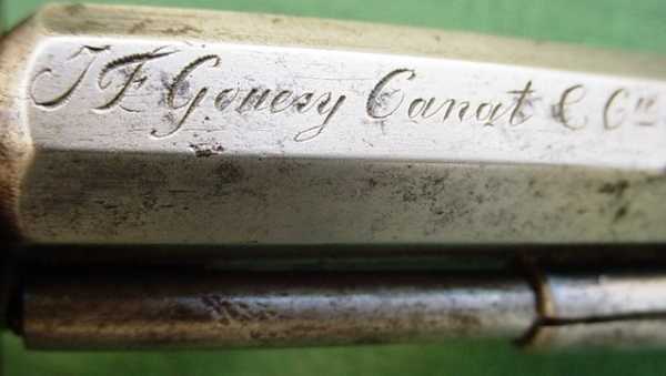 Шпилечные револьверы Ле Ма французского происхождения отличаются порой не только маркировкой, но и внешним видом. Это оружие, выпущенное фирмой Canat & Co имеет несколько изогнутую переднюю стойку рамки, поверхность барабана цилиндрическая. Шомпол отсутствует, но судя по расположению шомпольного кольца, вероятно он располагался под нижним стволом.