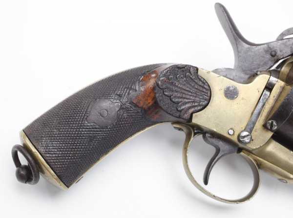 Принципиальная конструкция и компоновка у Le Mat не изменилась, однако очень необычным было применение металла желтого цвета (вероятно латуни) для изготовление не только рамки, но и центрального ствола револьвера.