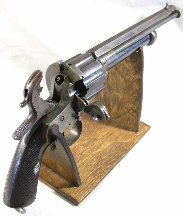 Вскоре был разработан и выпущен револьвер, центральный ствол которого снаряжался, так же как и барабан, шпилечными патронами.