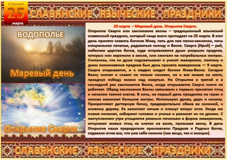 Сварга открывается, и к людям сходит богиня Жива-Весна. Сегодня Весну кличет и славит не только человек, но и все живое на свете, празднуя победу жизни над смертью. На Открытие в третий и в последний раз закликается Весна, когда открывается Сварг.