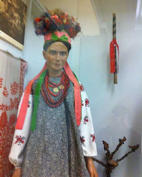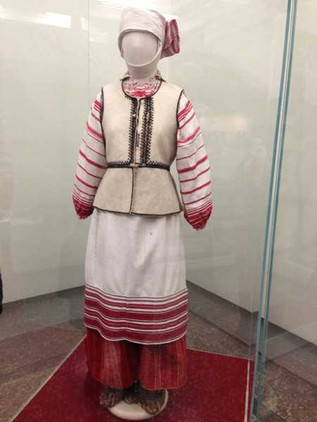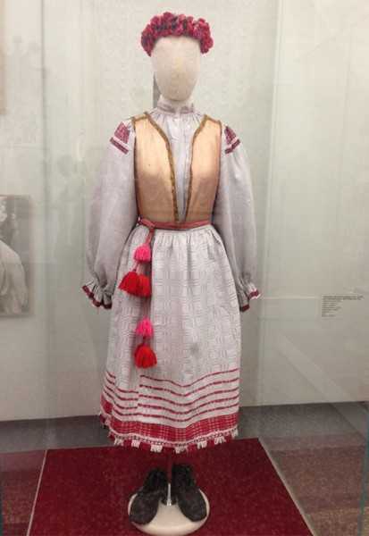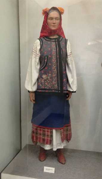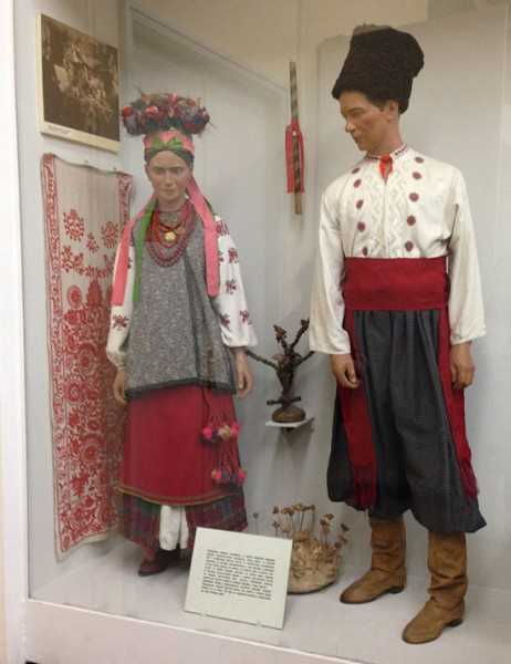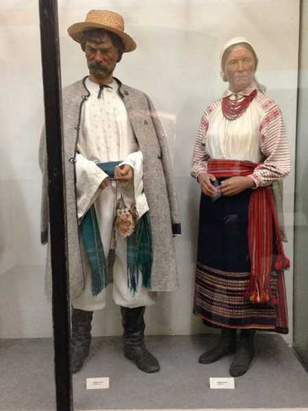 Украинцы в музее показаны на примере 4 групп — черниговщина, волынщина, Львов и Западная Украина, и еще свадебный костюм. За качество фотографий — примите извинения. В Черниговском костюме — на фото поверх рубахи надета плахта — не сшитая юбка из клетчатой ткани, впереди поэтому юбка расходится, поверх нее фартук. Безрукавка красиво вышита, причем вышита только правая сторона, которая видна. Лишних усилий не делали, то же касается и рубах — только видные части вышивались и украшались. Оригинальный платок с кисточками. Безрукавка, которая у белорусов называлась гарсеткой — в украинской одежде называлась кирсетка и имела более сложный крой.