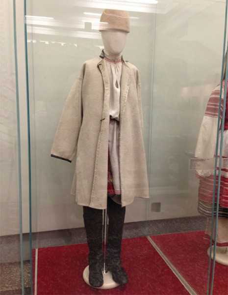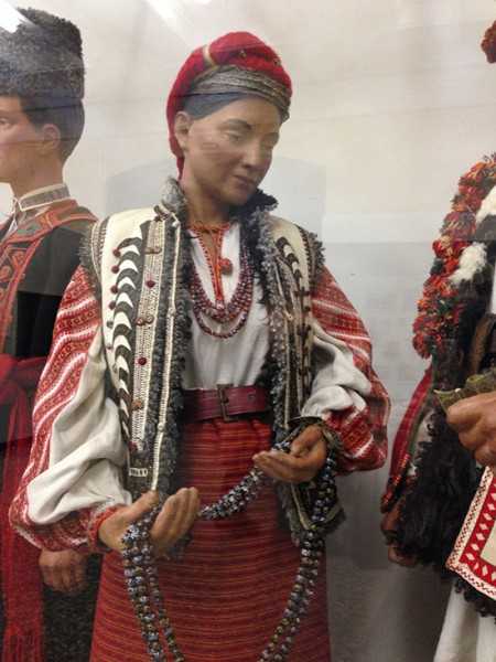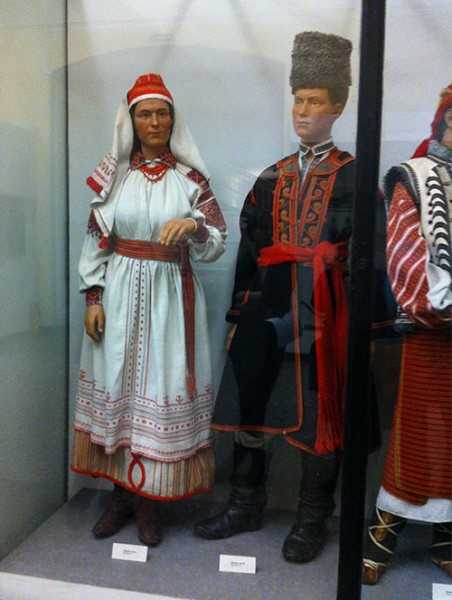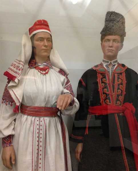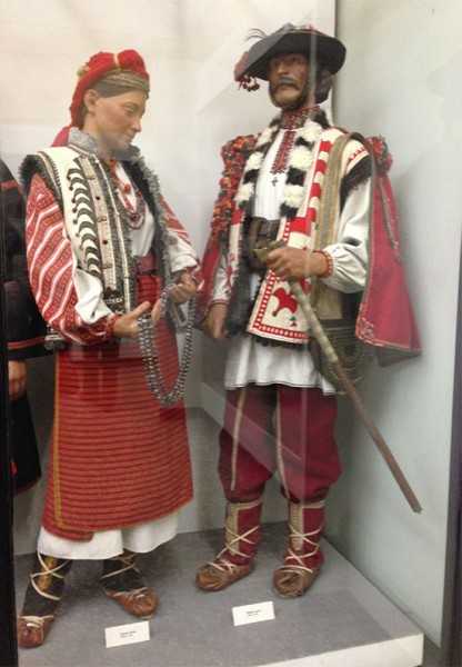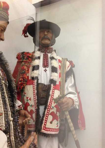 Это гуцульский костюм, он не только очень красочный, но и богатый — в руках у женщины дорогие венецианские бусы, продавались во Львове. Головной убор в виде красных плетеных кос из гаруса. Волос почти не видно, но головной убор напоминает прическу. Покрой брюк и обувь отличается большим удобством для ходьбы по горам. Очень широкий пояс, как и борцовские пояса сделан так, чтобы обеспечивать поддержку спины. Широкие пояса характерны для традиционных мужских костюмов. В этом костюме нет передника, поскольку юбка состоит из двух частей — попередницы и позадницы. Теплая верхняя одежда делалась из более теплых тканей, в том числе носили шубы, например гуцулы носили шубу из длинноворсового меха — jyf она называлась гуня.
