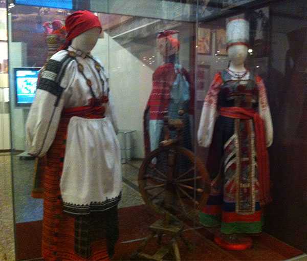 В среднем в год снашивалось 30 пар лаптей, поэтому лапти могли плести все, кожаная обувь у славян тоже была. Почему-то на стенде белорусов меньше всего украшений, возможно просто не делали на них упора, а может нет в колекциях музея — судя по фотографиям носили в основном пару ниток бус — в основном коралловые и бело-голубые пастовые. Древние очень красивые находят украшения.