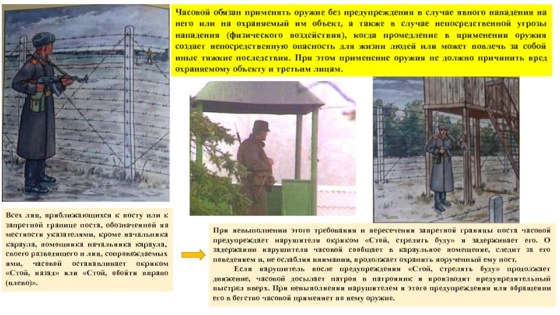 Когда кто-то нападает на подлежащий охране объект, а также на иные армейские объекты. При этом применение оружия часовым должно осуществляться в соответствии с уставом: вначале – выстрел вверх, а затем – огонь по злоумышленникам;