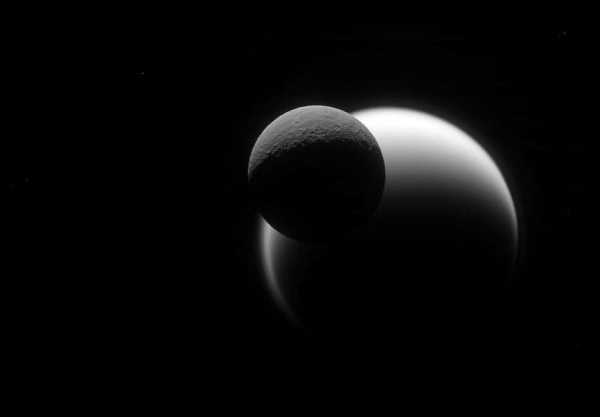 Ноябрь 27, 2005. Наиболее подробная фотография поверхности Дионы, покрытая кратерами и светлыми полосами (трещинами), была получена аппаратом ‘Кассини’ 11 октября 2005 года, когда он находился на расстоянии всего 19600 километров от луны Сатурна. Все кратеры на Дионе имеют светлые края и темное дно. Светлые детали снимка показывают наличие льда в этих местах, а темные — покрытую пылью поверхность. Пыль не может удержаться на склонах валов кратеров и стекает вниз, где и накапливается. По-видимому, вся поверхность Дионы — ледяная. Это делает ее похожей на Европу (луну Юпитера), которая тоже обладает толстой ледяной корой. источник Публикация 27.11.2005, 23-33, мск.
