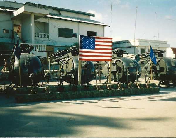 Вертолёт морской пехоты США UH-1 совершает патрулирование над Могадишо. Декабрь 1992 годаС учётом сложившейся внутриполитической обстановки в США на конец 1992 года президент страны Джордж Буш-старший выразил готовность отправить в Сомали американские войска. 3 декабря 1992 года СБ ООН принял резолюцию 794, которая на основании главы VII Устава ООН уполномачивала международные силы, отправляющиеся в Сомали, использовать «все необходимые средства» (подразумевалось разрешение на использование военной силы) для обеспечения беспрепятственной доставки гуманитарной помощи.