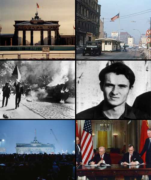 ![]() Берлинская стена на фоне Бранденбургских ворот, КПП «C» в Берлине, войска в Чехословакии, Ян Палах, демонстрация возле Берлинской стены, подписание соглашения о химическом разоружении Михаилом Горбачёвым и Джорджем Бушем. | |||