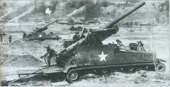 Американские войска обстреливают из 155-миллиметровых орудий северокорейские позиции по ту сторону 38-й параллели.
