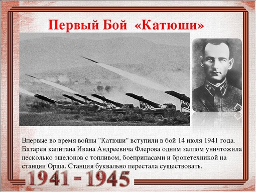 «Катюша» родилась незадолго до начала войны в цехах Реактивного научно-исследовательского института..[188] Известно, что решение о ее запуске в серийное производство было принято 21 июня 1941 года, а 14 июля в 15 часов 15 минут первая в мире батарея реактивной артиллерии в составе 7 боевых машин под командованием капитана Ивана Флерова неожиданно для врага нанесла мощный удар по железнодорожному узлу города Орши. За 8 секунд железнодорожный узел был уничтожен. Фашисты, ставшие очевидцами этого огненного кошмара долгое время не могли оправиться от шока и в последующем не раз предпринимали попытки захватить секретное оружие русских — «адские мясорубки», как они называли наши «катюши».