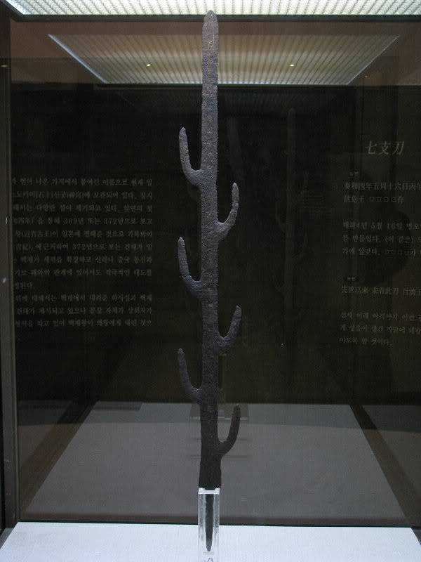 Причудливый клинок Нанацусая-но-тати (иначе «меч с семью лепестками») был обнаружен в синтоистском святилище Исоноками-дзингу, что в городе Тэнри, в 1945 году. Его форма указывает на то, что меч этот скорее всего был церемониальным оружием и не использовался в настоящем бою: от лезвия отходят шесть изгибающихся ответвлений, а «седьмым зубом», судя по всему, считается верхняя часть клинка. Надпись на лезвии гласит, что этот меч был подарен китайскому императору властелином Кореи. К сожалению, меч хранился в ужасных условиях, а потому его внешний вид оставляет желать лучшего.