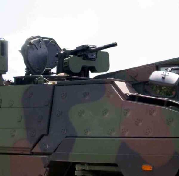 По бортам БТР Boxer различимы элементы крепления и сочленение отдельных модулей навесной брони AMAP