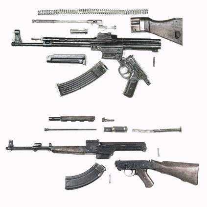 Что ж, давайте сравним известное нам оружие и посмотрим, что от чего произошло.Что ж, давайте сравним известное нам оружие и посмотрим, что от чего произошло. На картинке в заголовке — неполная разборка АКМ и StG-44. Хорошо видно главное отличие АК от штурмгевера — Калашников выбрал схему разборки оружия «вверх», через снимающуюся крышку, в то время как Хуго Шмайссер выбрал схему разборки «вниз», через откидывающийся на шарнире спусковой механизм.