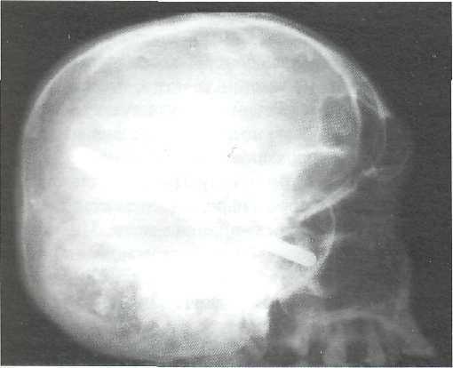 Рис. 22—9. Диагональное проникающее ранение стрелой из арбалета. Краниограмма представлена из нейрохирургического отделения московской ГКБ № 7 В.А. Невзоровым.