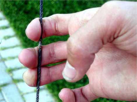 Второй по значимости элемент захвата — позиционирование тетивы относительно суставов дистальных фаланг пальцев. Наиболее важно положение указательного пальца, поскольку он устанавливает правильность захвата остальными пальцами. Тетива располагается в 2-4 мм от сгиба сустава указательного пальца (см. рис. 4.3.). После захвата тетива не должна скользить, двигаться или по-другому менять позицию на пальцах. Захват в сгиб сустава может быть очень болезненным, жестким и вызвать образование волдырей под кожей.