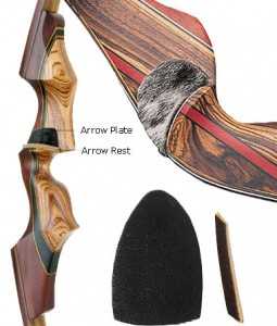 Накладка на полку (полочка) служит горизонтальной опорой для стрелы и заглушает шум, производимый стрелой при натяге. Боковинка, которая крепится непосредственно на рукоятку лука рядом с полкой, служит той же цели. Накладка на полку может и не закрывать всю ее поверхность, но обязательно должна закрывать ту ее часть, которая находится непосредственно под стрелой при натяге. Боковинка, в свою очередь, также может быть любого размера, но обязательно должна доходить до макушки оперенья стрелы при прохождении ее через рукоятку лука. Какой бы материал для полочки и боковинки вы не использовали, убедитесь, что стрела проходит легко и бесшумно.
