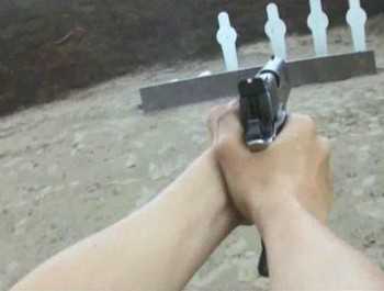 Пистолет извлечён чуть более чем наполовину. Курок взведен, а указательный палец уже нажимает на спуск, хотя дуло ещё не на линии выстрела.