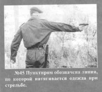 Финальная позиция: выстрел уже произведен. Дуло побывало на линии выстрела, ещё когда касалось края кобуры, но инерция заставляет продолжать движение вверх.