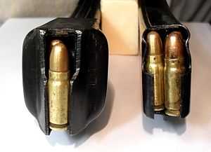 Сравнение магазинов ППШ (слева) и ППС (справа).Благодаря длинному ходу подвижных частей ППС имеет более низкий, по сравнению с ППШ, темп стрельбы. Можно вести стрельбу даже одиночными выстрелами, плавно нажимая и быстро отпуская спуск.