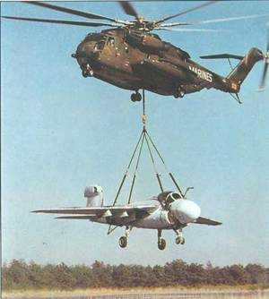 Транспортировка вертолетом СН-53Е на внешней подвеске легкого танка и самолета Грумман ЕА-6 «Праулер»