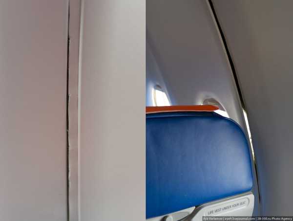 05. Качество просто ужасное. Панели не стыкуются между собой. Везде какие-то щели и дырки. Сквозь некоторые дырки виден свет, надеюсь они не сквозные ;). Тот же член экипажа рассказал: «Это один из первых самолетов. Да, качество у него на уровне Жигулей, зато недорогой. Вот, если будут делать ВИП салон, то там будет все супер, комар носа не подточит. А здесь, чего вы хотите? Армавии нечего жаловаться, они и так на него получили огромную скидку.» Я очень много летаю, но такого кошмара не видел ни в одном самолете.