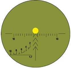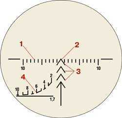 4. Дальномерная шкала. Состоит из кривой пунктирной и сплошной горизонтальной линии. Рассчитана на высоту цели 1,7 м (средний рост человека), значение которой указано под горизонтальной линией. Над кривой пунктирной линией нанесена шкала с делениями, один пункт которой соответствует расстоянию до цели 100 метров. Значения шкалы, обозначенные цифрами 2, 4, 6, 8 и 10 соответствуют значениям 200, 400, 600, 800 и 1000 метров соответственно.
