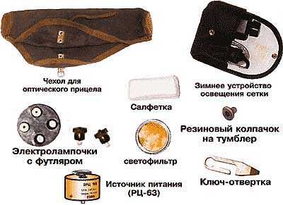 Устройство освещения сетки. Предназначено для освещения сетки прицела при стрельбе в темноте или сумерках. Состоит из батарейки (источник электрического тока), корпуса для батарейки с контактным винтом, колпачка с упором и пружиной, который служит для поджатия батарейки к винту, проводков, соединяющих винт, к которому подключен центральный электрод батарейки через тумблер и самого тумблера, который включает и выключает электролампочку.