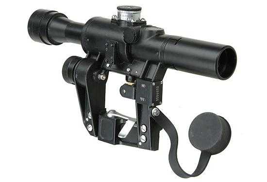 Точка прицеливания — это вершина у основного угольника, куда «падает» пуля. Поле чистое и строго очерчено по краям. Прицельное приспособление с изображением цели располагается в фокальной плоскости на объективе, поэтому глаз снайпера приспосабливается лишь на одно расстояние. Удаление выходного зрачка на девяносто миллиметров от линзы окуляра разрешает стрелять и в очках, и в противогазе, обеспечивая при этом и безопасность от отдачи винтовки.