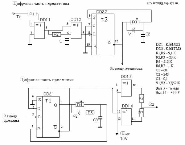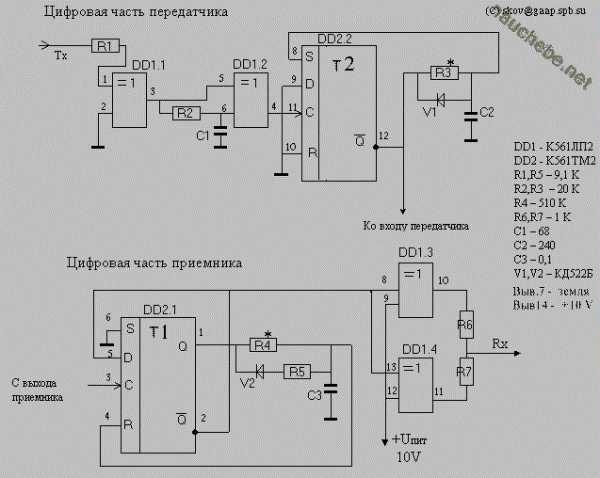 Описание принципиальной схемы. Сигнал Тх с выхода ком-порта через ограничивающий резистор R1 поступает на схему выделения фронтов, собранную на элементах DD1.1, DD1.2. Hа выводе 4 элемента DD1.2 присутствуют импульсы длительностью около 1 микросекунды. Временные параметры этих импульсов не достаточно стабильны, поэтому в схему включен генератор нормированных по длительности импульсов, собранный на триггере Т2. Он формирует импульсы длительностью около 3-4 микросекунд. При необходимости длительность подстраивается резистором R3. Для тех, кому важна стабильность/надежность/дальность работы линка и допустима максимальная скорость работы 57600, я бы посоветовал удвоить номинал С2 и тем самым увеличить длительность нормированного импульса до 8 миллисекунд. Можно использовать специальный переключатель максимальных скоростей 115200-57600. подключающий дополнительную емкость С2. (длина проводников до переключателя должна быть минимальна). Схема цифровой части приемника содержит триггер Т1 с элементами R4,R5,C3,V2, задающими максимальную длительность единицы на выходе триггера. При указанных на схеме номиналах, она равна примерно 5 миллисекундам. Если кто-то собирается работать только с большими скоростями, имеет смысл уменьшить это время путем уменьшения С3. Hа элементах DD1.3, DD1.4 собран выходной усилитель, сигнал с которого поступает на вход Rx ком-порта. Это на всякий случай. У меня все прекрасно работало на перепутанном мотке проводов длинной 20 метров, когда я брал неусиленный сигнал (через резистор 1К) прямо с вывода 1 триггера Т1. Теперь несколько слов о настройке схемы. К счастью, цифровая часть приемопередатчика является совершенно самостоятельной и самодостаточной схемой, допускающей полную настройку и отладку без всяких лазеров и аналоговой части. Порядок настройки. Создайте файл килобайт на 300, содержащий один символ (мне понравился Y). Создайте батник, который засылает этот файл в ком-порт, а потом вызывает сам себя 😉 Запустите его. Проконтролируйте длительности и формы импульсов в передатчике.(лучше это делать на максимальной скорости, поскольку импульсы короткие). Закройте батник. Замкните выход передатчика на вход приемника, а выход приемника подайте на вход Rx того же самого ком-порта. Войдите в любую терминальную программу ( я пользовался DN-ской терминалкой) Попробуйте понажимать на клавиши. Вы должны увидеть нажимаемые символы на экране. Если этого не происходит, попробуйте просто замкнуть Rx и Tx и добиться описанного эффекта настройкой терминальной программы, после чего снова попытайтесь сделать то же самое через приемопередатчик. И наконец, последнее, самое важное испытание. Тут потребуется уже два компьютера. Соедините их ком-порты тремя проводами по классической схеме. Запустите какой-нибудь софт,использующий этот линк. Убедитесь, что все работает. Теперь попробуйте в разрыв одного сигнального провода вставить цифровой приемопередатчик. Попробуйте поработать с этим же софтом через эту железку и убедитесь, что FIRDA вас вполне устраивает ;-))), имитируйте помехи в передаче доступными вам способами. После этого можно переходить к постройке аналоговой части линка.