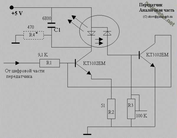 Передатчик. Особых пояснений, как мне кажется, он не требует. Лазерный диод является коллекторной нагрузкой первого транзистора. Резистор в его эмиттерной цепи ограничивает ток через этот транзистор и создает условия для работы второго транзистора, который является фактически (совместно с R1) управляемым делителем входного напряжения. Второй транзистор управляется фототоком диода, встроенного в лазер для организации схемы ограничения температурного дрейфа его параметров. С увеличением светового потока увеличивается базовый ток второго транзистора, и он шунтирует входной сигнал на уровне, безопасном для лазера. Подстроечный резистор R3 предназначен для регулировки допустимого уровня излучения лазера.Номиналы схемы подобраны так, что при комнатной температуре можно уменьшить его сопротивление до нуля и это не приводит к фатальным последствиям для лазерного диода (по крайней мере у меня проблем не было). Настройка передатчика сводится к измерению амплитуды сигнала на резисторе R2 (при подключенной и работающей цифровой части) и установление подстроечным резистором амплитуды импульсов, соответствующей импульсному току 30-35 ма (при комнатной температуре). (Речь идет о 5-и милливаттных указках). Для надежности можно уточнить эти цифры для конкретной указки путем измерения тока через нее при перезаряженных аккумуляторах (до разборки). Эту величину можно в дальнейшем принять за номинальный импульсный ток через указку. Если в схеме используется R4 (у меня его нет), и часть тока всегда течет через этот резистор, на соответствующую величину надо уменьшить выставляемый ток через R2, так что бы суммарный импульсный ток оказался в указанных выше пределах. При изменении температуры параметры излучения, конечно, будут плавать, но разброс значений будет существенно снижен за счет отрицательной обратной связи по световому потоку через фотодиод и второй транзистор. Резистором R4 можно выставить начальный уровень тока через лазер в отсутствие сигнала. Считается, что это повышает живучесть лазерного диода. С1 с этой же целью сглаживает переходные процессы при включении/выключении лазера. К питанию особых требований нет, можно взять +5В из компьютера. В заключение пару слов о разборке указки и ее цоколевке. Могу рассказать только о своей паре указок. Настолько это типично — не знаю. Сначала я делал надпил корпуса надфилем по периметру указки на уровне кнопки включения указки. Часть с батарейками отламывается. Становится видна маленькая печатная платка, на которой крепится кнопка. Платка припаяна прямо к выводам лазерного диода. Иголкой измерил глубину до втулки, в которую запрессован собственно лазер. Сделал второй надрез, стараясь попасть на уровень втулки, в результате чего получил обрубок указки с полностью сохраненной оптической частью, а с другой (обрубленной )стороны торчали три вывода с платой, которую я отпаял. Итак, остались три вывода, торчащие из обрезанной части указки. Они расположены треугольником. Один из них соединен с корпусом лазерного диода. Это общий вывод лазерного диода и фотодиода. Предположим, что этот вывод соответствует верхнему углу треугольника. Тогда справа внизу будет расположен вывод фотодиода, а слева внизу — вывод лазерного диода. Перед разборкой полезно провести исследование расходимости луча лазер