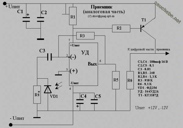 Аналоговая часть. Этот блок требует наибольшей аккуратности и, я бы сказал схемотехнической культуры при построении и наладке. Питание лучше брать не из компьютера, а от отдельного стабилизированного блока питания. Длина проводников должна быть минимальна. Фильтрующие питание конденсаторы C1,C2.C4,C5 д.б. расположены максимально близко к выводам операционного усилителя. Особенно важно близкое расположение к ОУ элементов входной цепи С3, VD1, R4. Желательно компактное расположение и экранирование всей конструкции. При грамотной схемотехнике у вас не должно быть никаких проблем с настройкой. У меня на столе не было выполнено ни одно из перечисленных выше требований и тем не менее все успешно работает. Так что есть надежда, что если сделать все правильно,то у вас тоже будет работать ;-))) Пару слов о самой схеме. Она предельно проста. Соблюдайте полярность фотодиода! Резистор R4 влияет на амплитуду сигнала с фододиода и на его форму/частотные характеристики. Чем меньше номинал резистора, тем меньше сигнал с фотодиода и тем лучше его форма. У меня получались вполне приличные результаты при увеличении резистора до 4.7 К. Однако спешить с его увеличением я бы не советовал. И вообще, первое, что вы должны добится — это работа приемника на какой-нибудь умеренной скорости, ну например 57600. Это лучше делать в следующем порядке. Итак, после десятой проверки монтажа выводим сопротивление подстроечника R1 в ноль и включаем питание. Подключаем к ком-порту собранный передатчик (цифровую и аналоговую части), запускаем батник (предварительно установив скорость работы порта 57600), позволяющий наблюдать непрерывную картинку передачи одного байта (о нем шла речь в первой части трилогии), располагаем лазер со снятой оптической системой в двух-трех сантиметрах от фотодиода, подключаем лограф к выходу приемника и начинаем медленно увеличивать сопротивление R1. Через некоторое время транзистор Т1 начнет приоткрываться, и на выходе приемника появится гребенка импульсов. Оптимальное значение сопротивления R1 определяется в ходе экспериментов визуально по форме и амплитуде импульсов на выходе приемника. При выключении передатчика амплитуда шумов на выходе приемника не должна превышать 1-2 вольта. Транзистор Т1 должен быть лишь слегка приоткрыт. Типичное значение напряжения на его коллекторной нагрузке- 1-2 вольта. После достижения успеха на этом первом этапе можно двигаться дальше — постепенно раздвигать приемник и передатчик, находить их наилучшее взаимное положение и, подстраивая R1, получать гребенку импульсов амплитудой почти равной амплитуде питания +12В. Форма у них может быть не совсем прямоугольной, но амплитуда должна быть хорошей. При максимально возможной раздвижке передатчика и приемника надо определить диаметр расфокусированного пятна лазера. Этот диаметр даст вам представление о максимальной дальности, на которой будет работать ваш линк. У меня этот диаметр равнялся примерно 20 см, что примерно соответствует динамическому диапазону в 33 дБ. Как мне кажется, этого вполне должно хватить для уверенной связи на расстоянии 100 метров без применения входных линз или на расстоянии 200 метров, если использовать сведотдиод типа ФД320 в виде красной пластмассовой линзочки диаметром около сантиметра на прямоугольном основании. А при наличии входной оптики..