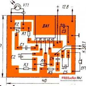 Приемный узел выполнен на микросхеме DA1, представляющей собой усилитель ЗЧ. Ко входу усилителя подключен фотоприемник на фототранзисторе VT1. Попадающий на него сигнал от лазерной указки абонента усиливается и поступает на телефонный капсюль BF1, размещенный в телефонной трубке. Рис. 3 Лазерный светотелефон. Печатная плата передатчика.
