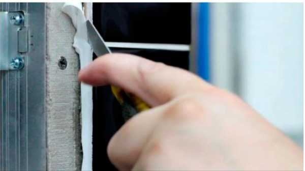 10. Прорезать проем дверцы острым ножом. Нож следует держать под углом 30-40 градусов, с наклоном лезвия в сторону внутренней части двери люка. Прорезать следует так, чтобы отделяемая часть герметика оставалась на ребре плитки люка, а не на ребре плитки закрывающей раму.