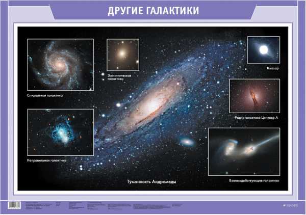 Подобно тому, как Солнце является одной из звезд Галактики, наша Галактика – одна из множества галактик Вселенной. Мир галактик очень разнообразен. Галактики отличаются своим внешним видом, массой, размером и свойствами (нормальные галактики, активные галактики и т.д.). В центре данной таблицы — изображение Туманности Андромеды, ближайшей к нам галактики (не считая спутников нашей Галактики).