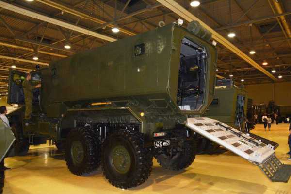 Обитаемые объемы корпуса разделены на две части. Первая – кабина водителя. В ней имеются три сиденья, для водителя и сопровождающих. Кабина оснащается системами связи и другим необходимым оборудованием. Модуль для перевозки десанта выполнен в виде отдельного агрегата, монтируемого на шасси. Ранее упоминалось, что в модуле десанта можно разместить до 16 кресел для солдат. Выставочный образец машины получил только 14 мест для десанта.
