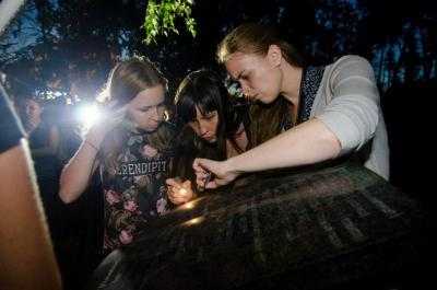 Взяв фонарики, мы отправляемся на место бывшего кладбища – в парк около ДК химиков. Мы стоим буквально на костях. В память о покоящихся здесь людях оставлен каменный крест. Правда, высечены на нем не все имена, а только известных людей – прадеда русского писателя Льва Николаевича Толстого, поэта Гаврилы Петровича Каменева, первого путешественника в Антарктиду Иван Симонова и других. А у экскурсоводов тем временем начинает барахлить техника. «Это случается не первый раз. Такая уж энергетика у этого места», — поясняют они.Подсвечивая путь фонариками, идем к сохранившимся с XVII века стенам Кизического монастыря. На улице становится прохладно, нас ждет теплый автобус. Провожатые просят проверить, все ли на месте. И тут мы замечаем, что потеряли двоих попутчиков. К счастью, через несколько минут они возвращаются к нам. Оказалось, они искали еще одну мистическую достопримечательность парка – большую сосну. Говорят, что ветки на ней растут неестественно изогнуто, а на коре высечена буква «Г». Кем оставлен этот символ и что он означает, неизвестно. В полном составе продолжаем наш путь.