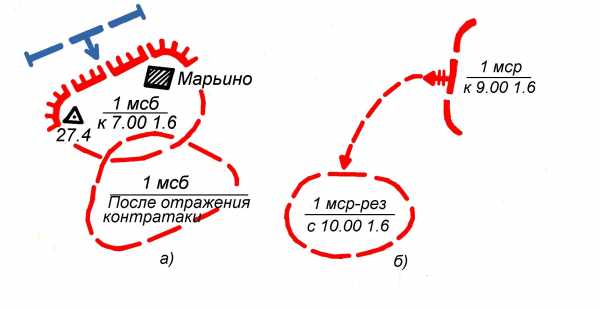 Обозначение на карте времени занятия обороны: а) всеми подразделениями 1 омсб к одному времени; б) подразделениями 1 омсб к разному времени | |