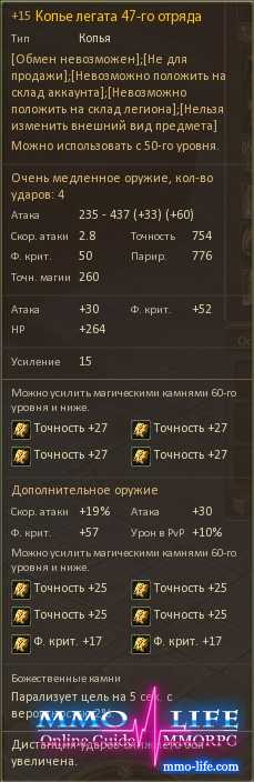 | Копье иллюзий Лаистригоса | 55 | Атака 231-431, Точн. 741, Парир. 886, Точн.магии 254. ХП +349, Парир. +81, Ф.крит +41, Скор.атаки +17%. | |