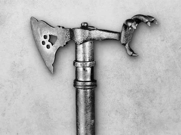 Этот боевой молот был изготовлен в Германии в 1593 г. Покрыт гравировкой, имеет позолоченные медные элементы декора. Верхний шип выдвигается из древка поворотом рукояти. Его фото использовано в качестве заглавной иллюстрации.