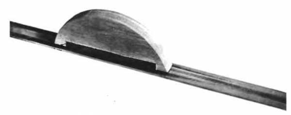 Для того чтобы убрать после фрезеровки клинка ямы и царапины, шлифуйте его поверхность наждачной бумагой на тканевой основе. Заменяя ее, по мере исчезновения огрехов, на более мелкозернистую. Наждачную бумагу набиваем на деревянный брусок длиной 150-200 мм. И возвратно-поступательным движением шлифуем поверхность клинка. На рисунке изображен полукруглый абрис, который автор использовал для шлифовки дола.