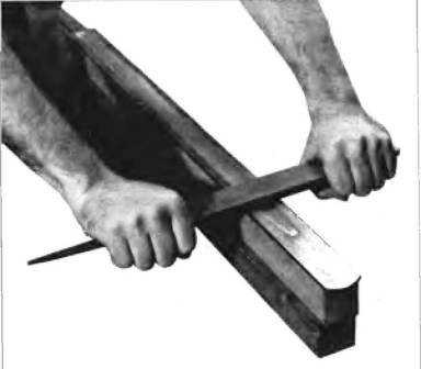 Для этого положим клинок на ровный брус и, прикрепив его струбцинами, начнем обработку поверхности большим, широким крупнозубым напильником. Напильник удерживаем двумя руками поперек клинка, предварительно зажав брус в слесарные тиски.