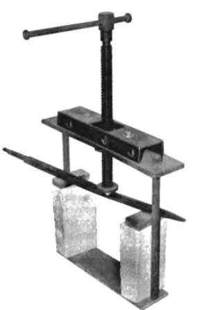 Если случилось так, что ваш клинок повело, и он стал слегка кривоват, можно использовать следующее незатейливое приспособление называемое прессом. Выпрямив клинок под прессом, так как показано на фотографии ниже, нужно снова произвести его нагрев газовой горелкой до температуры 200 градусов Цельсии. Если на глаз, то до приобретения светло-желтого цвета.