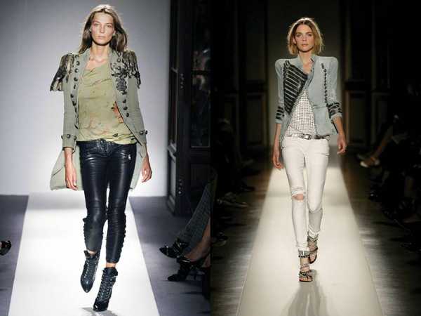 Жакеты в стиле милитари хорошо гармонируют с любыми фасонами джинсов. Брюки галифе можно также хорошо обыграть, дополнив их облегающим кителем и мягкими сапожками.