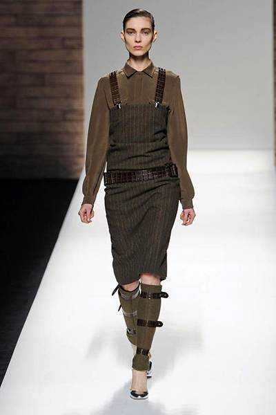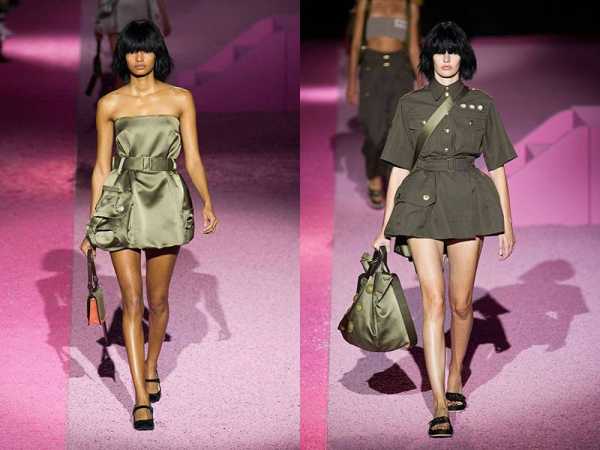 Дамские платья весьма отдаленно напоминают очертания армейской формы. Резкие угловатые линии кроя имеют много общего с готикой. Выбирают сдержанные фасоны с четко очерченной талией или узкие прямые модели, похожие на футляр.